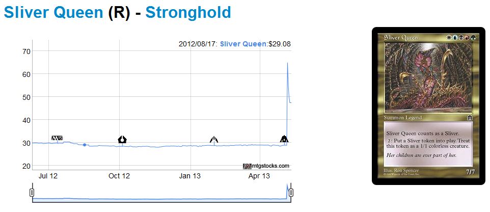 I’m really glad we decided to send out a blast on this one – the upside potential was definitely there. Even though the initial spike has since recovered as new copies are listed on TCG Player, I know that Sliver Queen’s price will now settle higher than where it was previously. The card is on the Reserved List and is a casual staple. After being a $20-$30 card forever, the increased casual player base will finally help drive this card up in price. Newer players will get to experience what some of us experienced when Slivers first came out.