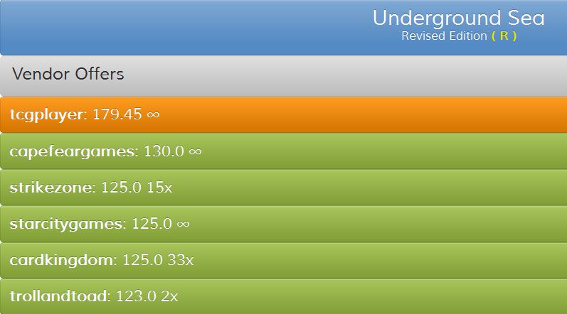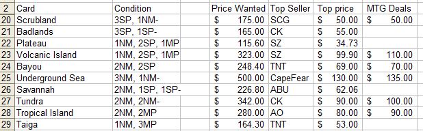 Dual Lands specifically had an enormous spread: I managed to sell three of my Underground Seas for NM price, but MTG Deals offered a full $20 less for my fourth copy, which I felt was NM- at worst!