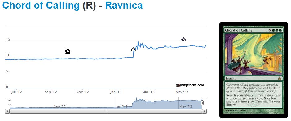 Chord of Calling did not show up in Modern Masters. What’s more, that Convoke ability is fairly special – I wouldn’t expect to see the ability show up in something like a Core Set. Could Theros implement Convoke? It’s not impossible, but I would say it’s highly unlikely. Chord of Calling could certainly show up alongside Birthing Pod in Modern Masters II or something comparable, but for now the card is a safe bet.