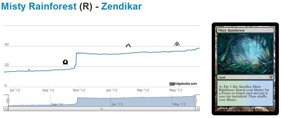But the short term view of Modern may not be as rosy from a speculation standpoint. With constant risk of reprints, previous “slam dunk” buys like Zendikar Fetch Lands now carry significant risk. In fact, the more expensive core Modern comes become, the more likely Wizards will introduce reprints. After all, it’s no coincidence that Modern Masters contained many of the high-priced cards in the format. The introduction of Mutavault in M14 is icing on the cake. Expect this chart to look very different in the coming weeks: