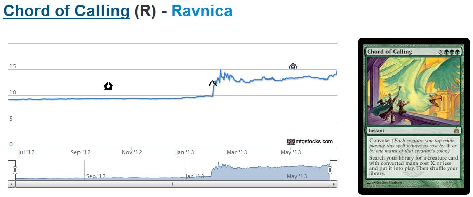 In other words, the trends on Dark Confidant and Tarmogoyf have already turned positive. Star City Games is buying both versions of Bob at $50, which in essence has removed all copies in the US market below that price. This trend is likely to continue as demand increases. I’ve even noticed Modern Staples not reprinted have already begun another incline well before Modern season. Consider the chart for Chord of Calling, which is already testing it’s all time high.