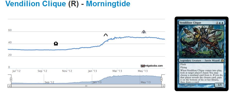 Vendilion Clique hasn’t “recovered” yet, but this Modern Masters Mythic Rare has also seen less than a 10% price drop. And as with Dark Confidant and Tarmogoyf, the price drop on Vendilion Clique still has not sent the card’s value to below where I initially sold.