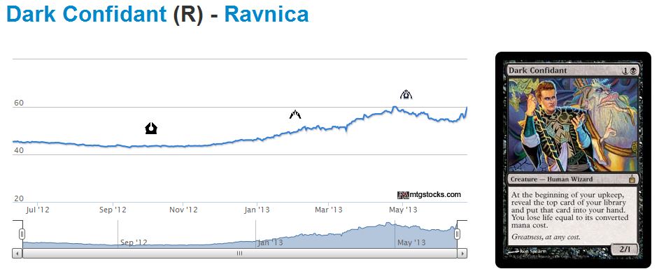 There were two major problems with this plan. First, despite my selling out during the midst of Modern season, card prices continued to rise well beyond. In fact, the price on Dark Confidant peaked well after Modern season ended in late April. Once Wizards confirmed Dark Confidant’s place in Modern Masters, the price did drop as I anticipated! But this leads me to the second problem.
