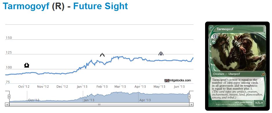The trend on Tarmogoyf is similar – the drop from peak to bottom was not quite 10%. In this case, the “bottom” lasted much longer since people knew this card would be in Modern Masters from the start. But the same recovery has already begun.