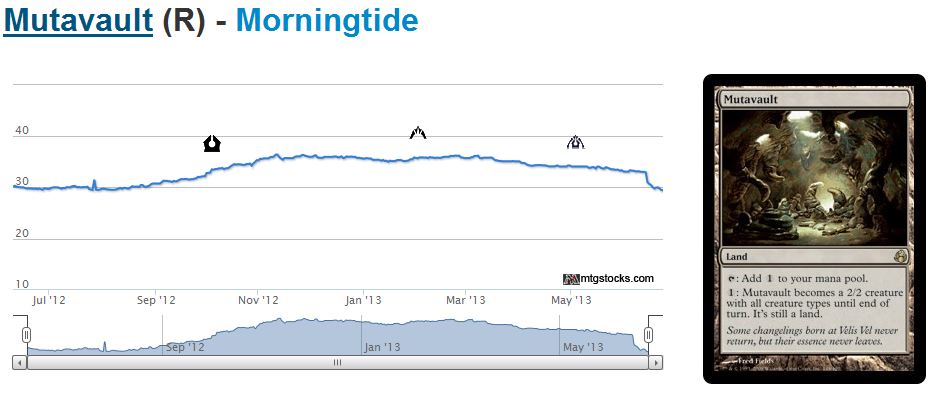 Once again the drop thus far has been only 10%. But the drop has accelerated recently and will likely continue once spoiler season rolls around and these reprints are confirmed. What I have lost with poorly timed sales of Tarmogoyf, Dark Confidant, and Vendilion Clique, I may yet recoup from Mutavault and Thoughtseize.