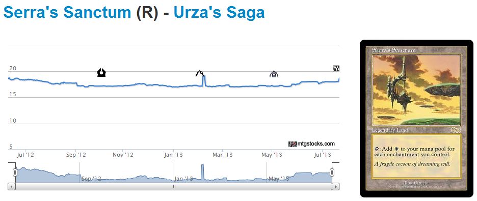 As the Insider Blast indicated, my favorite choice overall is Serra's Sanctum. The card has an obvious connection to enchantments, it is fringe Legacy playable, it is powerful in any enchantment-heavy EDH deck playing white, and it just got better thanks to the changes in the legend rule.