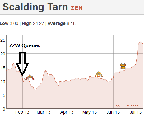 ZZW was awarded for Cube just prior to the release of Gatecrash. Scalding Tarn and Lotus Cobra both fell in price well into the release period, but Lotus Cobra only fully bottomed out months later at the end of June. Scalding Tarn dipped along with every other card from ZZW, but as a Modern staple, it has bounced back substantially in recent weeks, reaching an all time high of 24 tix.