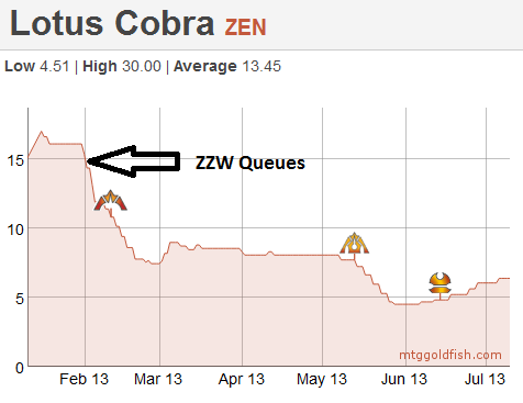 ZZW was awarded for Cube just prior to the release of Gatecrash. Scalding Tarn and Lotus Cobra both fell in price well into the release period, but Lotus Cobra only fully bottomed out months later at the end of June. Scalding Tarn dipped along with every other card from ZZW, but as a Modern staple, it has bounced back substantially in recent weeks, reaching an all time high of 24 tix.