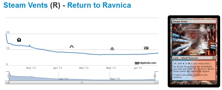 A good test will be Shock Lands. Many people expect these foils to skyrocket at some point, but this will only happen if Modern players start to demand foils. This in turn will only happen once the Modern format matures so that players can adopt a single deck and play it for years (like in Legacy). I’d hate to pimp out Melira Pod only to have Wizards ban Pod or for some new strategy to become the next best thing 6 months later. Oh, and fear of foil reprints in Modern Masters product also hurts. Time will tell, but there’s definitely opportunity.
