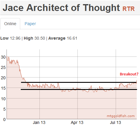 As for the MTGO version, if the paper price breaks out and starts heading higher, the feedback loop of higher paper prices leading to higher MTGO prices through redemption should begin. If you are thinking of buying Jace in order to speculate, keep your eye out for a price breakout in paper. This would signal further gains to come on the digital version.