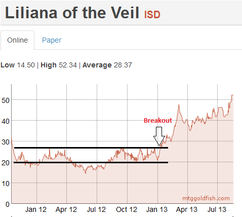 In this case, the breakout was over a month after the price began moving on MTGO. Identifying the shift that was under way on MTGO could have yielded nice profits on the cardboard version.