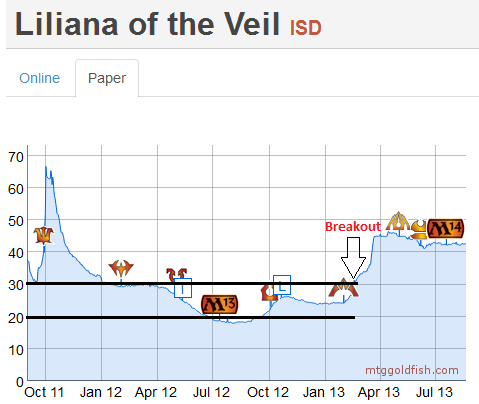 From the value perspective, Liliana of the Veil had a number of things going for it on MTGO. In January of 2013, relatively few copies of Liliana of the Veil were coming onto the market as ISD was not being actively drafted. Besides a stable supply, playability of the card was good. It looked like the card was going to be an all-format staple as it was showing up in Legacy, Modern and Standard.