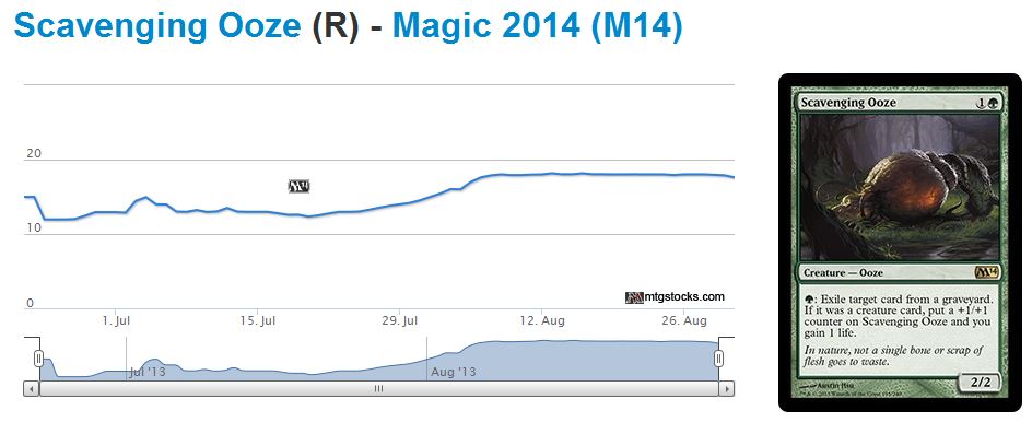 Enjoyed the article! I especially like the elaboration on Ooze as I know we have chatted about it a bit on twitter. I think you’re spot on with retailers ignoring the slight dip in the card. With Theros just over the Horizon, I think retailers are happy to sit on these knowing that they are a solid card. Also, I think they are the only ones who know the true supply of the Promo packs. So if they’ve already been told they won’t be getting anymore promo packs it’s easy for them to establish a price basis.