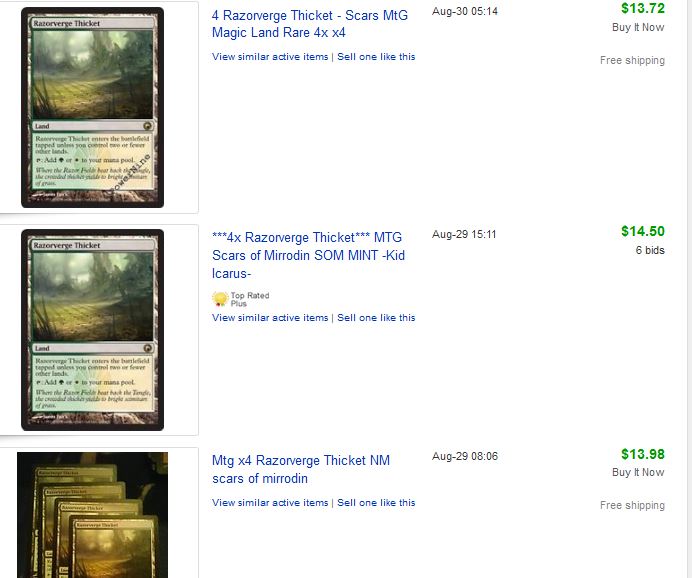 - Razorverge Thicket has another interesting price setup. On the retail side, I see SCG selling for $2.99 and TCG Player average is $2.32. Reasonable. Buy list price is also in line at $1.75. But the eBay selling price is out of place, with sets selling at around $14! That’s $3.50 each–-higher than all other prices out there. Could this card finally be gaining some price momentum upwards?