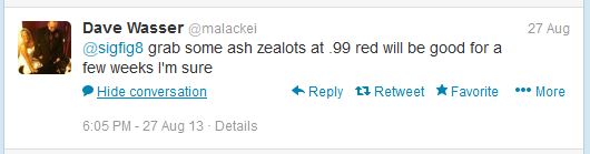 The implication: the market for Ash Zealot is there, and at least one retailer is bullish on the card. Perhaps Star City Games had excess copies they wanted to unload cheaply. In any event, these cards are up to $1.49 on SCG now, which is still a little low. I wouldn’t be surprised to see it hit $1.99 come Standard rotation.