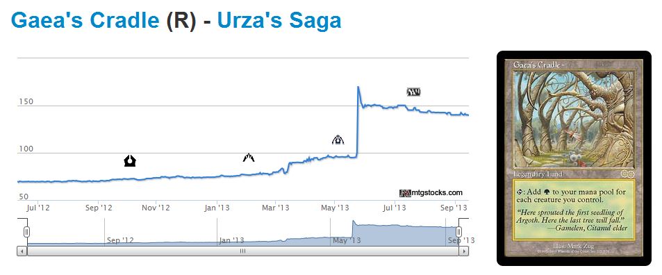 The drastic price spike we saw in the graph above wasnāt driven by casual players. It was driven by speculation--and largely irrational speculation at that. The same occurred with Gaea's Cradle once the new legend rule was announced.
