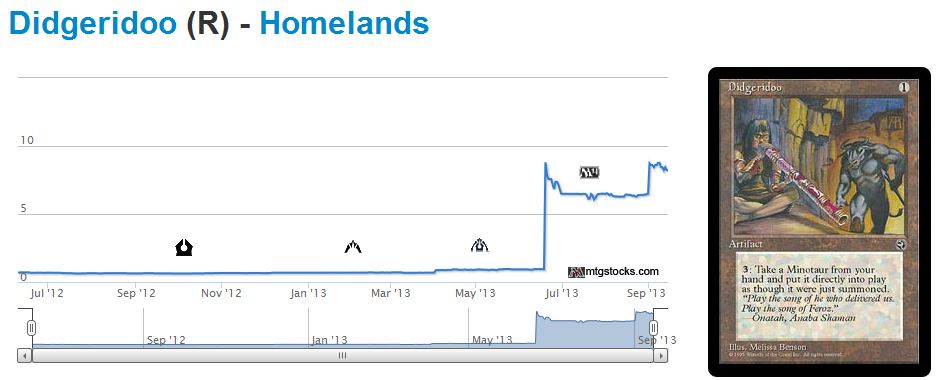 This type of irrational behavior is what occurred with Didgeridoo. The price inched up a little bit, got the notice of many speculators who then wanted the card even more, and drove the price up further on this unplayable Homelands artifact.