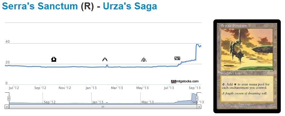 For those who jumped in on Serra's Sanctum with me a month or so ago, weāve made some serious profits by following our keen awareness of MTG speculator behavior. Enchantment Theme in Block + Reserved List + Fringe-playable Land = Good Investment.
