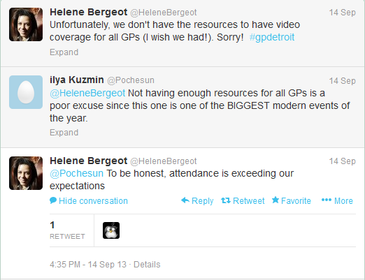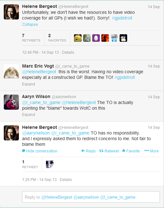 Well, Pros show up to every GP, though. So saying we needed coverage at Detroit because Pros were there isn\’t super compelling considering they, due to their budget, have to skip a GP or three, and that means skipping a GP with lots of Pro Players. Now, spending money to cover a Limited GP and not spending that money to cover a Modern GP when they are trying to make Modern popular makes no sense. The only thing that made sense to me, coupled with clues from my conversation with Helene and her tweets this week, was that they didn\’t expect anyone to show up to GP Detroit.