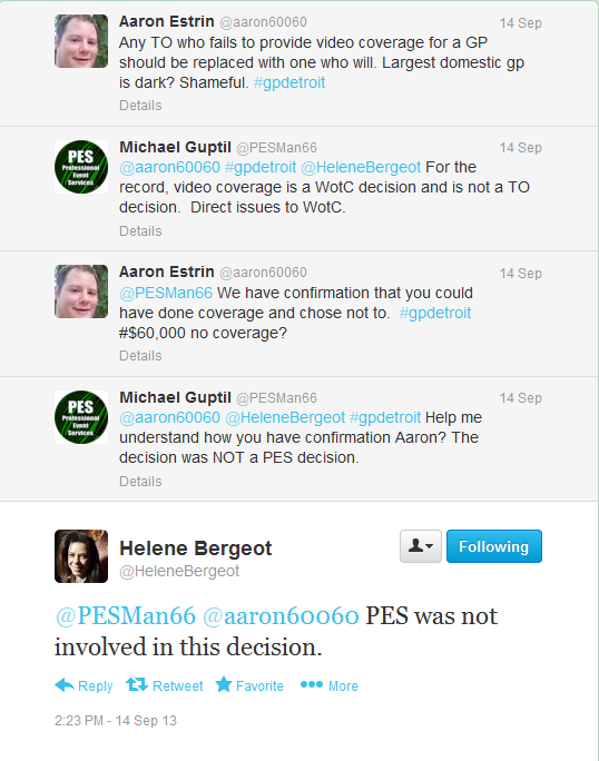If you can't tell the difference between one of the 15 vendors around the floor who were free to buy and sell mats and the TO, maybe you should stay home and stick to a game like MODO which untaps your lands for you. I'm not going to stump for PES or anything, but, come on. If you want to be upset for something they did a terrible job at, feel free. You'll find something to be upset about and you won't even have to look that hard. But don't run your mouth off without getting the facts. PES was never going to be responsible for coverage at GP Detroit. It's not the TO's purview.