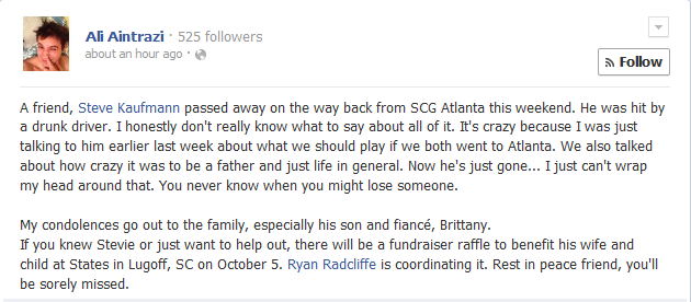 Steve was a dedicated grinder and family man, and back in May he managed to win the SCG Open in Charlotte. I didn't know him well, but it's always sobering when this community loses one of our own and my thoughts are with his young son and his fiancee.