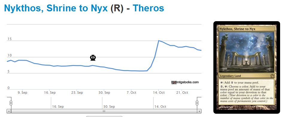 I want to begin this article by thanking Gervaise for his diligent coverage of PT Theros. His insights gave me the confidence to buy into very profitable opportunities, the largest of which was Nykthos, Shrine to Nyx. Without him I would have stopped at just a couple play sets. But thanks to his tweets along with those of a few others in the QS community, I moved in on a couple additional play sets which banked me solid profits.