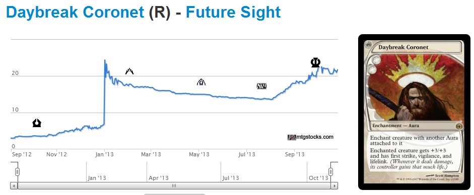 I know Future Sight was opened less and it was before the mythic rare era, etc. etc. That’s fine. The fact of the matter is that Daybreak Coronet, along with others like Fulminator Mage and Chord of Calling, all shot up hundreds of percent in short time and even maintained their higher prices.