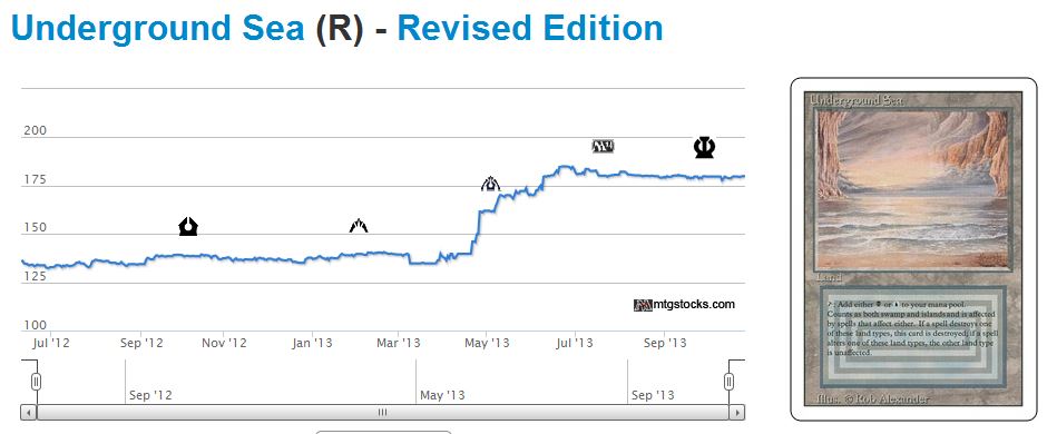 Maybe Underground Sea? I don’t know–-it feels like this card has stagnated lately. But perhaps it’s just establishing a new price floor before it goes even higher? Even though Berkshire Hathaway’s stock is $175,000 a share this is supported by the holdings that the company maintains. Underground Sea’s value is buoyed by demand from a group of hobbyists. Which do you think is more likely to last another 20 years?