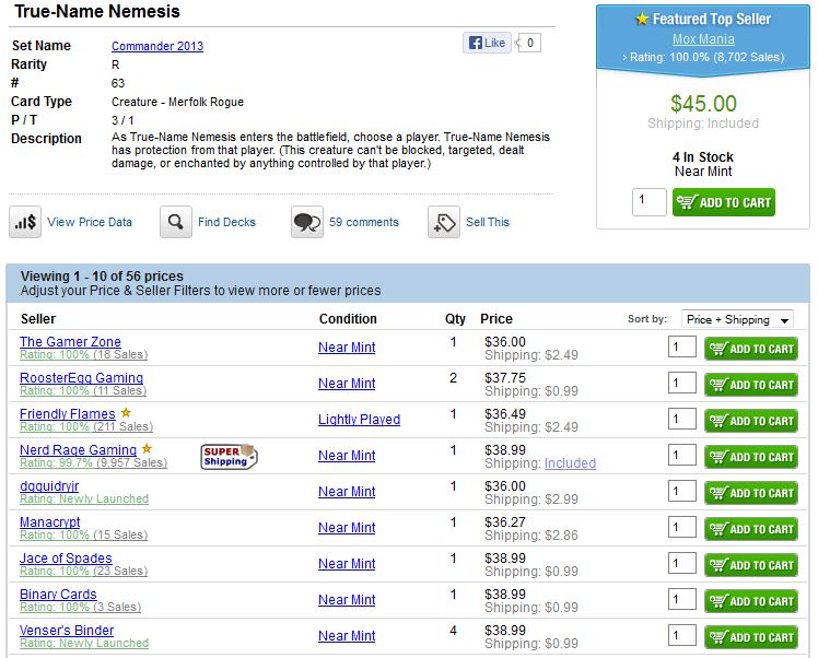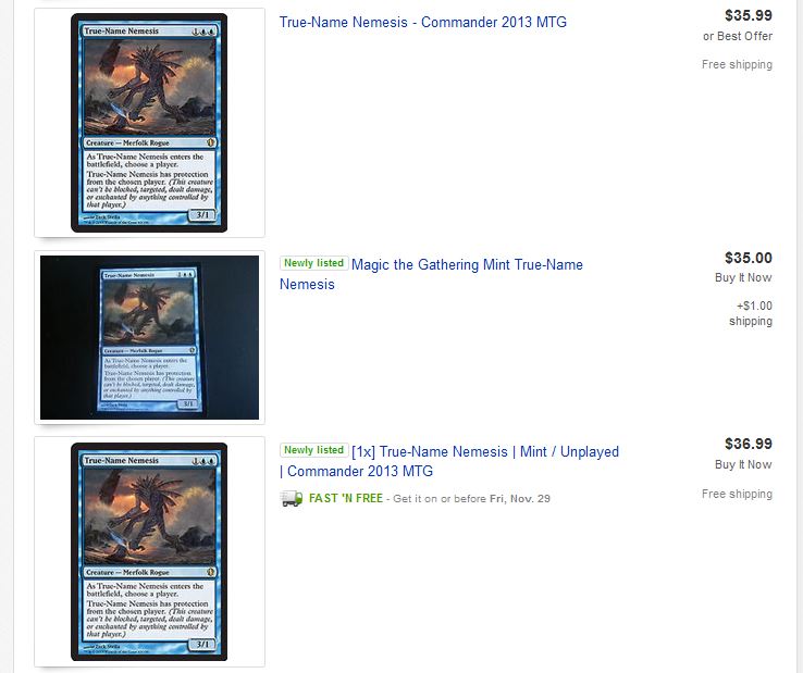 It’s easiest to highlight this lesson with an example. Let’s say a major retailer decides to offer one of the hottest Commander 2013 singles on the market at a discounted price on Black Friday. They may advertise “25% off all Commander 2013 singles!!” to draw your attention. So you check out the store’s listings and go directly to True-Name Nemesis. After all, that’s the most important card worth grabbing at such a great discount, right?