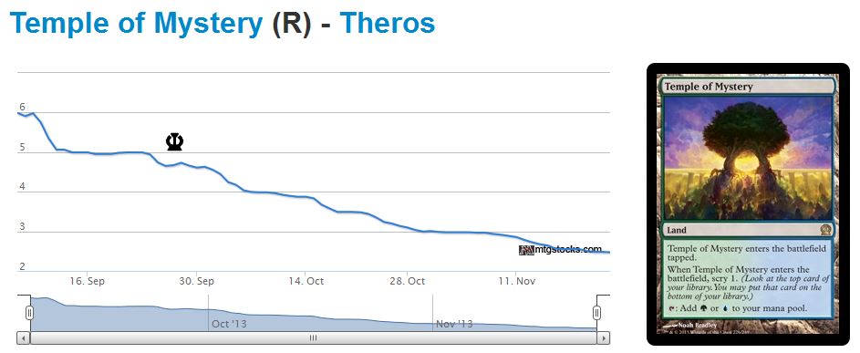 The latter because of the same reasons I buy into every rare mana-fixing land cycle: prices will bottom soon and rise significantly next year. In fact, Temple of Mystery is already tempting me because I can acquire sets near $8.