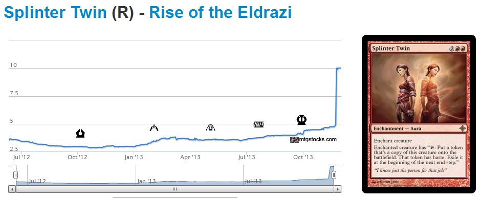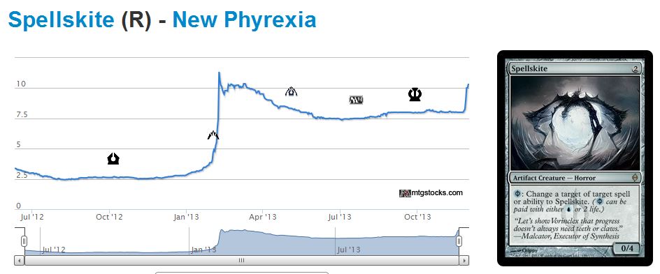 As MTG speculators we like to be on top of things. Often times the most profit can be had by being one of the first to embrace a card’s potential growth. We all knew that Splinter Twin was the cornerstone of a successful tier-one Modern deck. We also knew that this same tier-one Modern deck could be slowed down significantly by Spellskite. Thus the recent price jumps come as no surprise.