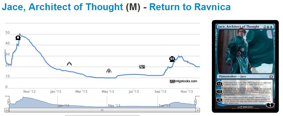 Everyone knew Innistrad would be leaving in a few short months, causing a sudden increase in demand for many Return to Ravnica block cards. Then when Theros launched and Standard rotated, the RtR block spike occurred.