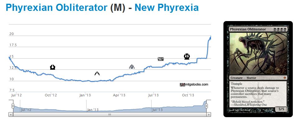 I do wonder if selling speculative cards like Phyrexian Obliterator could be the play. I may miss further upside, but I also take profits now without risking a drop should the mono-black devotion strategy not pan out in Modern. Food for thought.