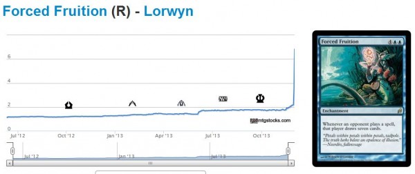 Has anyone else noticed the recent resurgence of price jumps lately? Just last month I was writing about how MTG finance was becoming stale. Now every time I check mtgstocks.com I notice interesting movement. This morning it was Forced Fruition, which I can only imagine is being bought out for the same reasons Wheel and Deal spiked one week earlier.