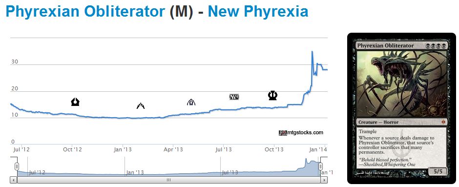 Still, I fully expect this one to settle down at a lower number than its peak…like every other spike these days. Example: Phyrexian Obliterator.