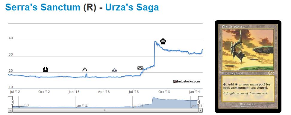 This effect is magnified with newer cards, where copies are so readily available. At least with Serra's Sanctum there are far fewer copies in circulation, and the Reserved List provided me with even greater protection.