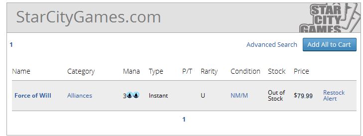 - Remember when I used to warn people that SCG had over 100 Force of Will in stock and that they were dropping in price rapidly? Yeah, that warning doesn’t have merit any longer. Expect a move higher on these after all.