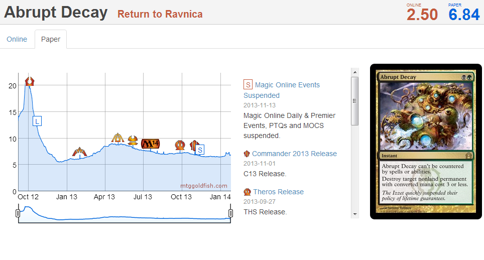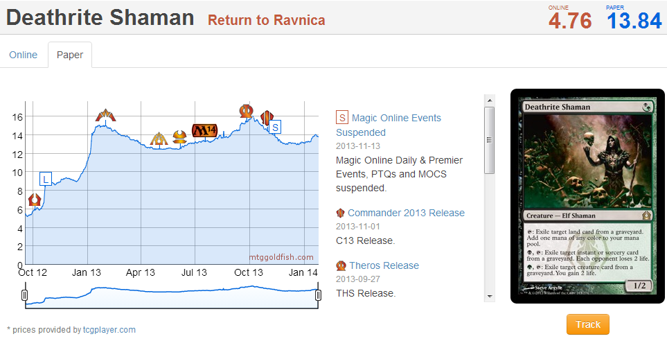 Deathrite Shaman sees virtually no Standard play but is still only a couple dollars off its all-time high. Due to its price being based mainly on eternal formats, it will likely see little to no dip at rotation. Being a rare from a large fall set is a downside, but the design of the RTR block means that RTR rares aren’t quite as risky a venture as those from Theros or Innistrad. My biggest concern with Deathrite is that it will earn a ban in Legacy or Modern, but is that really likely? I definitely see it discussed on Twitter and elsewhere, but I don’t think we’ve reached the level of saturation to make the card ban-worthy.