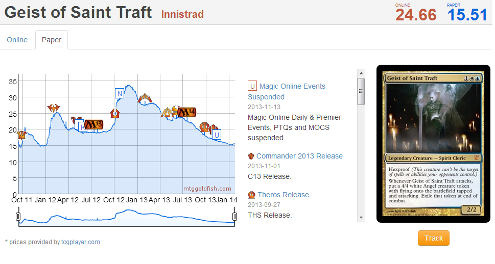 Geist, on the other hand, has been steadily declining since before rotation, and is actually at its floor now. This may be partially due to True-Name Nemesis taking its spot in many Legacy lists. The card is still extremely powerful and legal in Modern, so expect a rebound at some point in the not-too-distant future.