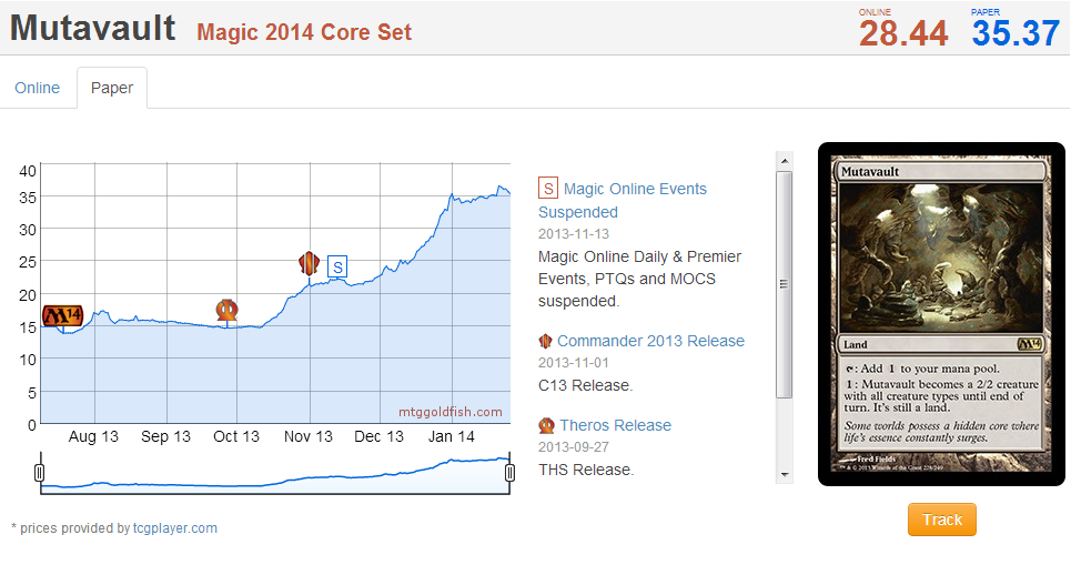 Okay, with Mutavault, it’s probably wise to sell your copies now. The card is at its ceiling and is seeing play in the most dominating decks of the current format—it has to drop when it stops seeing play in Standard. But keep in mind that this was a $40 card before it was reprinted, M14 was not a very popular set, and Modern Merfolk is becoming more and more popular. The next floor on this card may not be the $15 we saw several months ago. I’ll be keeping a close eye on how Mutavault performs over the next year, because if it drops far enough, all of the factors are right to make this a huge gainer after rotation.