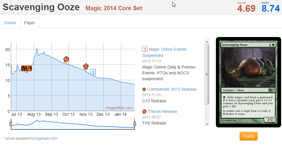 As you can see, this is a diverse group of cards with a number of factors influencing their prices. Scavenging Ooze, Deathrite Shaman, and Voice of Resurgence are all seeing basically no Standard play but have maintained value despite this. Each, however, is close to its floor, so it’s important to stay aware of the trends with these cards. There will come a time to pick them up, and after that time has passed, we’ll be kicking ourselves if we missed it.