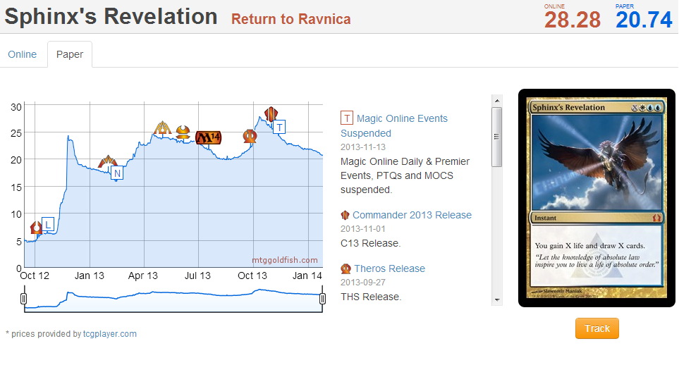 Besides Mutavault, Sphinx's Revelation is the card on this list with a price most influenced by Standard play. The card does see play as a one- or two-of in Modern control decks, so it will be worth targeting when the price is right. Given how much it dominated last year’s Standard format, price memory may force us to wait until post-rotation for this particular pickup.