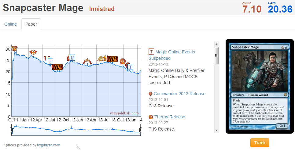 Remarkably, the time to buy in to Snapcaster was way back during Innistrad preorders. It’s a rare card that consistently stays above its preorder price, but we have found one here. Its post-rotation floor seems to have just passed us by, with the card seeing a small incline in the last several days.