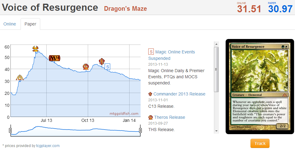 This card is seeing virtually no Standard play but is still $30. Why? Well, partly because of Modern, but mostly because of being from Dragon’s Maze. With nothing from the set seeing play or worth anything, something has to hold value, and this is it. If GW starts seeing a bunch of Standard play, we could see Voice spike in Standard, and if that happens, it will likely never be cheaper than it is now. If GW doesn’t see play, though, we could see this drop as low as $20 before turning around. Don’t expect to get a rotation discount on this one—keep an eye out for the floor and don’t hesitate to get your copies when we reach it.