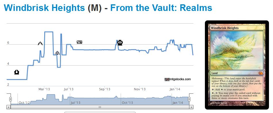 This results in an odd consequence. When a new seller comes to TCG Player and lists their few copies at a cheap price to make a sale, mtgstocks.com registers this as a significant price drop. Do you really think the From the Vault printing of Windbrisk Heights is suddenly out of favor while the regular set printing is on the rise? Not likely.