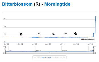 I've been asked a lot about Bitterblossom this last week. Bitterblossom coming out as an unbanned card has not been hugely surprising. As I mentioned last week, I'm not disappointed in missing this train. I truly feel like this is a misfire - as a reprint feels very much like it is in the works. Combine this with one alternative being the event deck possibly being B/W Tokens, and I forsee Bitterblossom's price being extremely volatile in the upcoming months. The real kicker is, we won't know where the coin will land until the middle of June, once the Pro-Tour Huey Qualifiers really kick off. Will a Bitterblossom based strategy even cut it enough to maintain $70-$80?