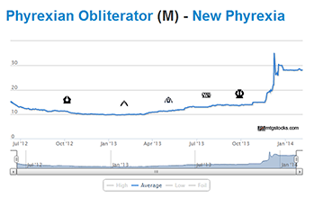 Phyrexian Obliterator has done just that. The original hype machine for Modern, it's proven that it could possibly be a contender. For now, Modern season is not actually in full swing, and there has not been anything to back up the hype. Â The price has stabilized and will either trend down or up, dependent on if the demand actually surfaces.