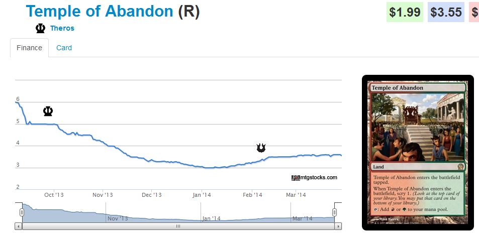 But just because the format is boring doesn’t mean money can’t be made. I often ignore Standard for six months of a given year, but I believe there are some prime acquisition targets right now. For example, I think it’s time to play the mana-fixing land market: Temples!