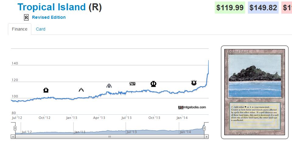 To dwell at length on these recent price bumps would be pretty redundant to last week’s article. I’ll just say that they are all on the rapid rise and if you can find any dual lands at older prices, you’d be wise to acquire.