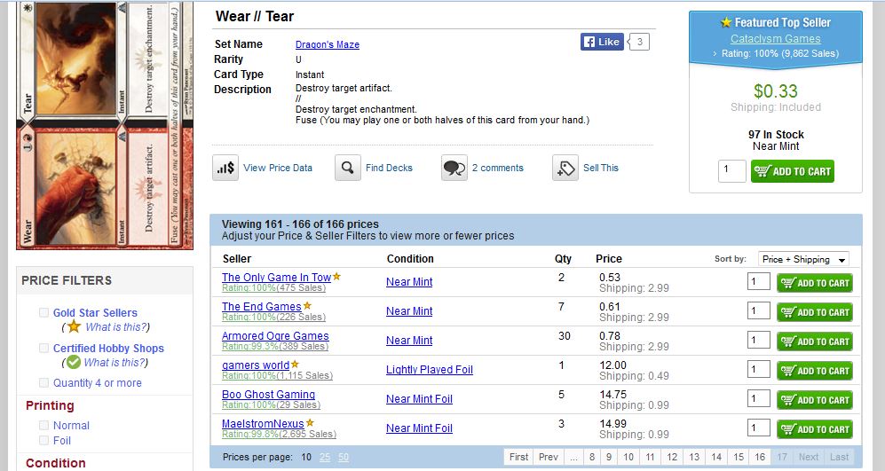 - Got any foil Wear // Tear for trade? I had no idea these were so expensive, but when a set is so under-opened like Dragon’s Maze was, even a random foil sideboard uncommon has a chance of becoming financially relevant.